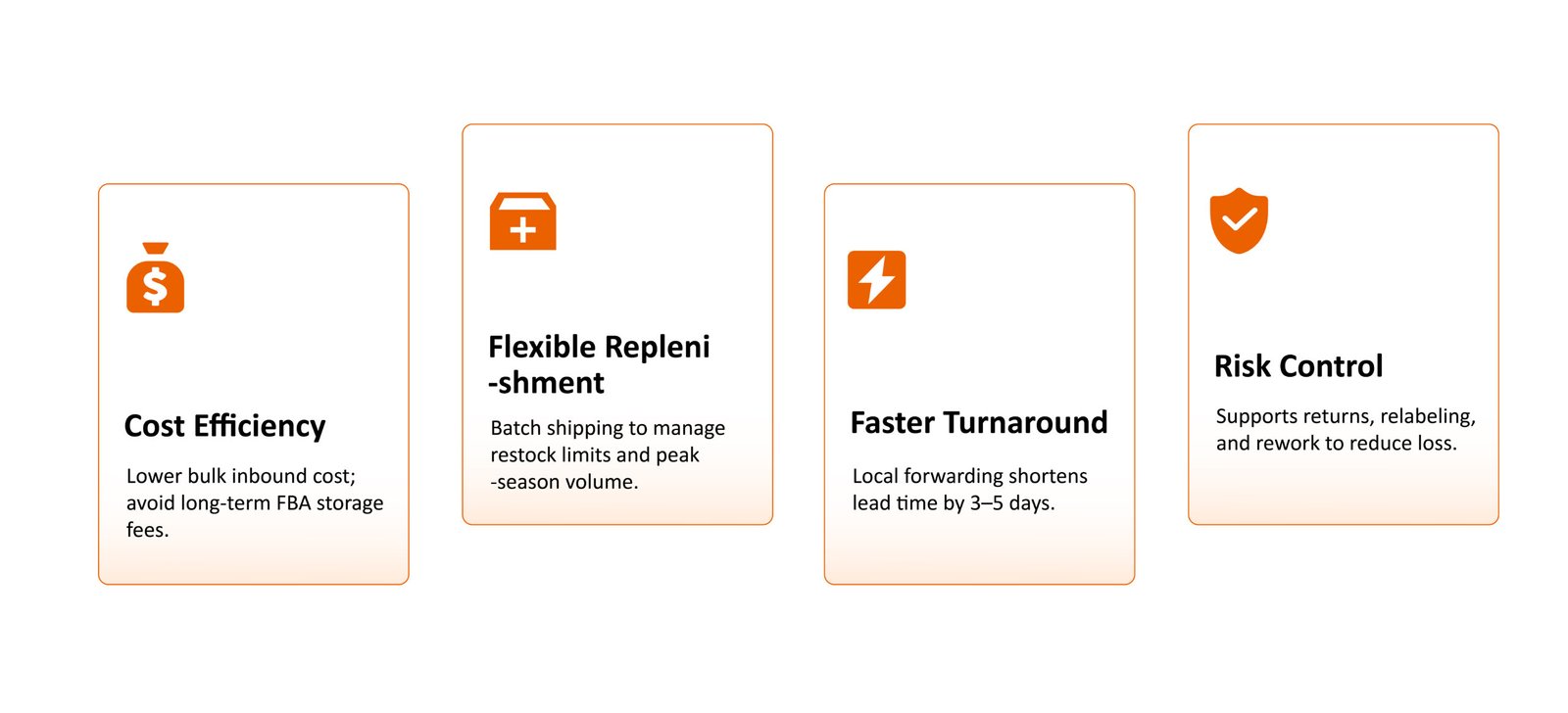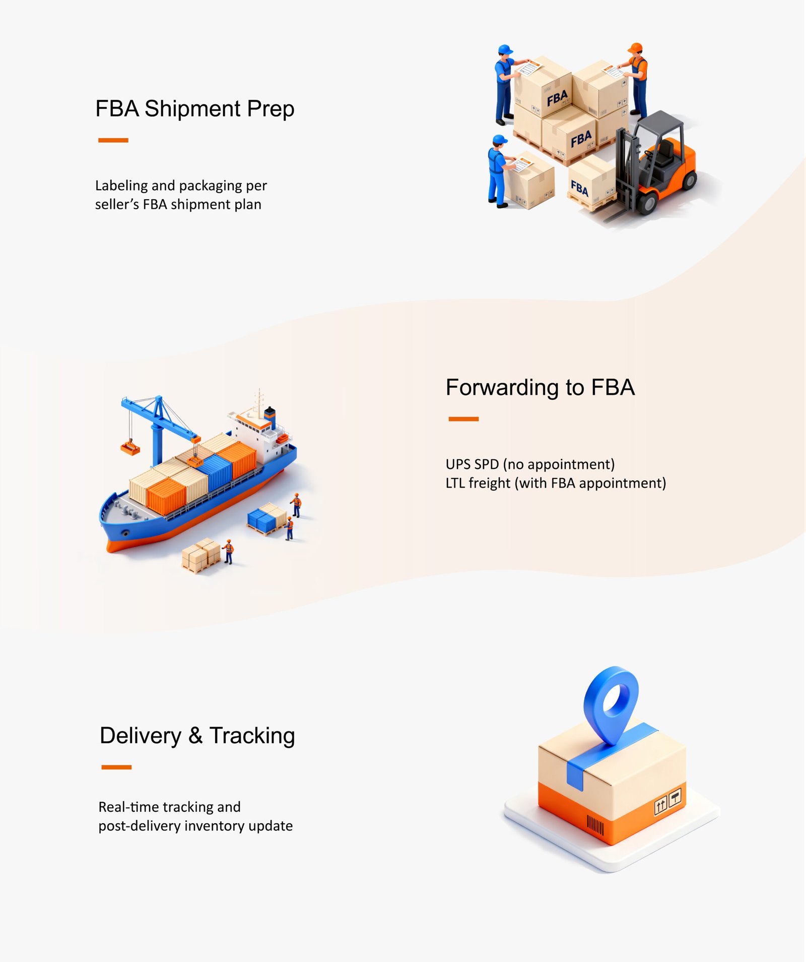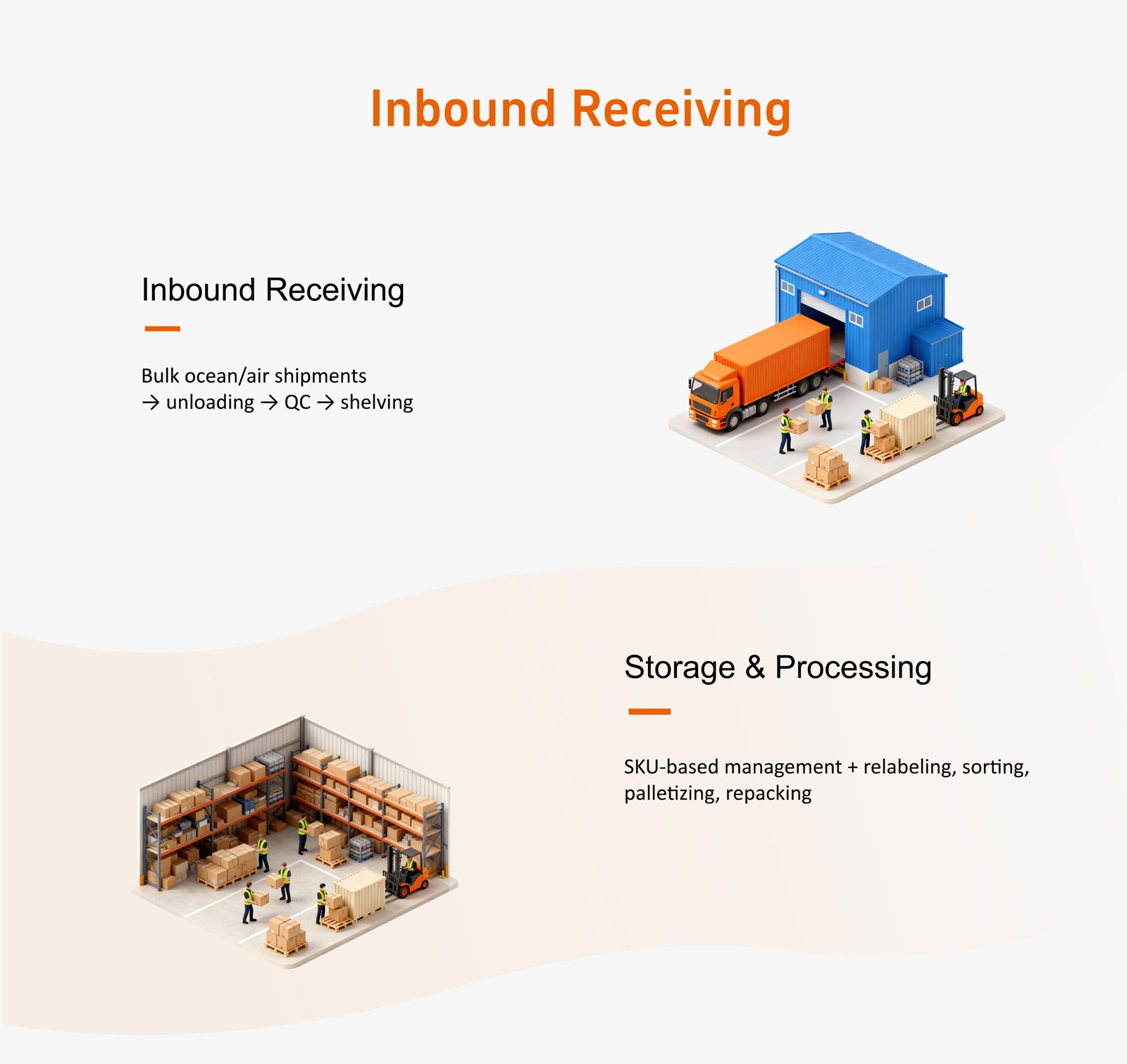 Delivering an end-to-end forwarding workflow from inbound receiving to storage, processing, and final FBA delivery.